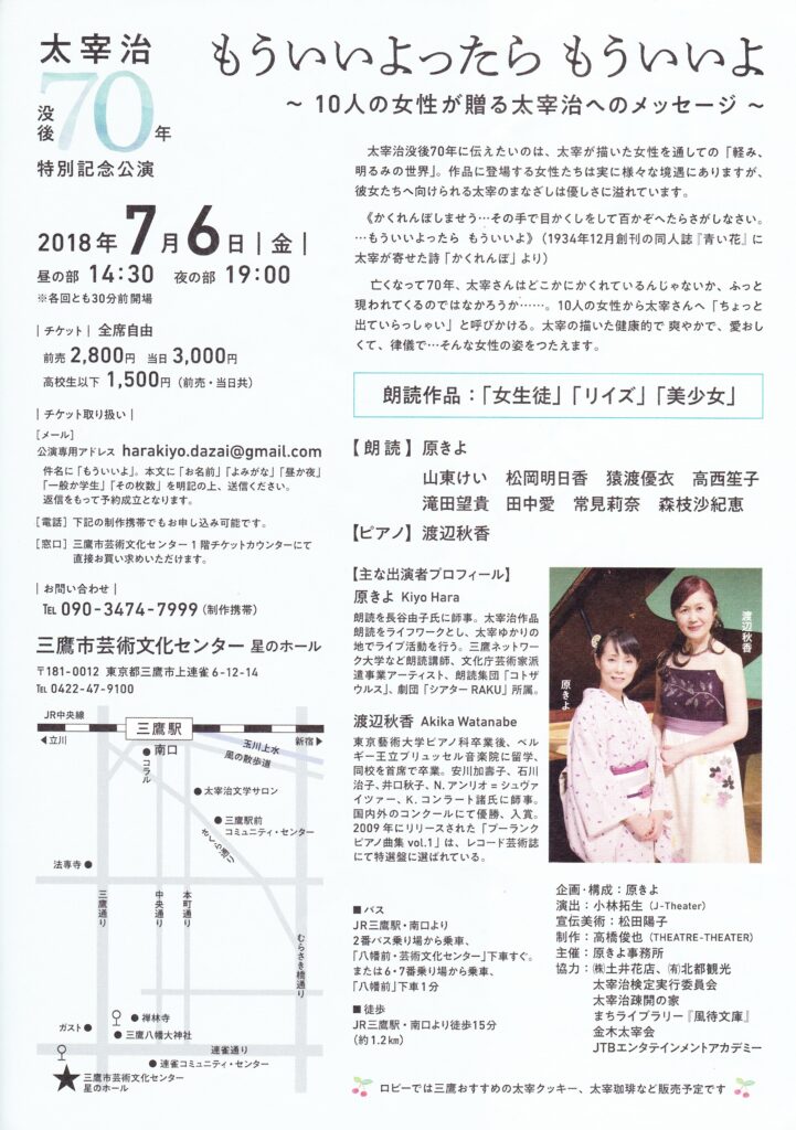 太宰治の作品「女生徒」を8人の若手舞台女優が演じ、「リイズ」「美少女」を原きよさんが演じました。音楽を考えたり朗読に合う曲を探すのは一苦労ですが、ぴったりな曲に仕上がると快感です。