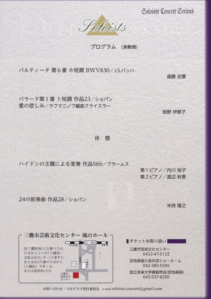 非常勤で伺っている国立音楽大学附属高等学校音楽科の講師陣によるコンサートです。素晴らしい先輩と2台ピアノを演奏させていただきます。ピアノ1台では味わえない、音の重なりや響きを楽しんでいただけると嬉しいです。